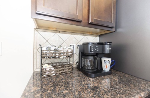Fully stocked chef’s kitchen with stainless steel appliances, gas cooktop, wall-mounted oven/microwave, and coffee bar