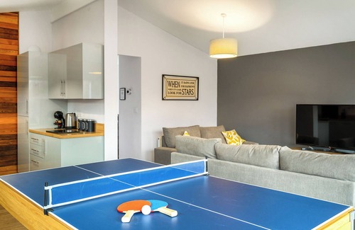 The spacious open-plan living, dining, and kitchen area boasts floor-to-ceiling windows, creating a bright and airy atmosphere. Enjoy movie nights on the Smart TV, challenge friends or family with the combined pool/table tennis/dining table, or chase high scores on the retro arcade games machine. The fully fitted kitchen includes all the modern conveniences: a coffee machine, air fryer, microwave, dishwasher, washer, and more.