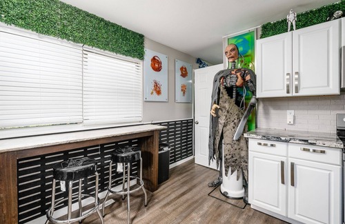 Your home boasts a barcade, books/games, 85” 4K TV, stage lighting, and aliens. Sleeping arrangements include four private bedrooms (3 Kings and 1 Queen) and two living room queen futons.