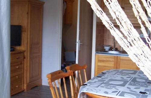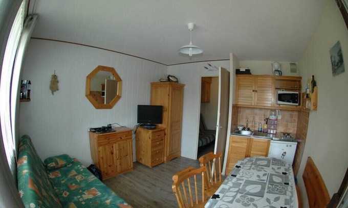 Furnished studio for 4 people, bright, warm, and quiet, in the heart of the village, close to all amenities such as the bus, shops, ski slopes, etc. South-facing on the first floor with an elevator.
