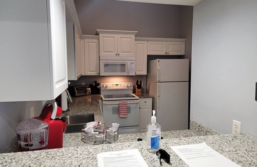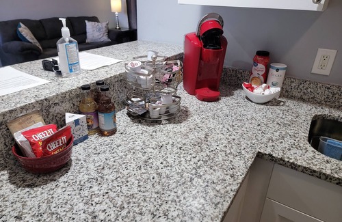 We recently upgraded our unit to give you the luxury stay you are looking for. Your bed is prepped just for you with top-of-the-line sheets and pillows with a fantastic pillow top mattress. When you ready to turn into bed you will find we have turned back your bed and left an Andes Mint on each pillow. Your bedroom also has a private walk-in closet with full dresser with a full length mirror also a sitting area to do your make-up and hair with mirror and lighting. The bathroom has long body towels and wash cloths that are soft, plush and top of the line. You will also find the bathroom fully stocked with Shower Gel, Shampoo, Conditioner and Lotion as well as a blow dryer and extra towels. In the kitchen you will find a fully equipped kitchen. We provide a Keurig Coffee Maker for your morning coffee along with a couple of Otis Spunkmeyer Muffins and three types of coffee flavoring such a hazel nut, french vanilla and more. We have added tea to our full line of coffee as well as hot chocolate. We also provide ice cold bottled water in the refrigerator when you arrive and a few light snacks for you to enjoy such as crackers, chips, rice crispy treats and more.