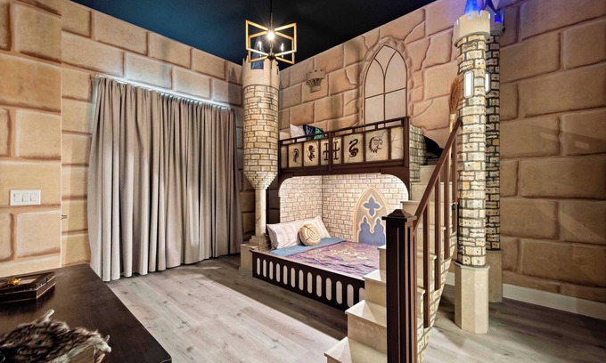 Room 2 – Wizard Castle Bunk Room: A magical, castle-inspired kid’s room complete with turrets, wooden staircase, and enchanting details.