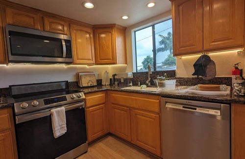 Stay near from the beach in this bright and breezy 3-level condo with parking spot, rooftop patio, and room for 6 guests. Enjoy fast WiFi for WFH, a 75” Smart TV, in-unit laundry, and fully equipped kitchen. Ideal for families, remote workers, and long-term stays.