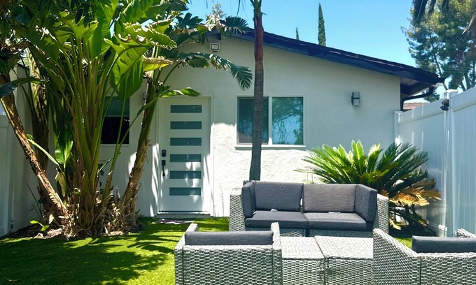This beautifully furnished 1-bedroom guesthouse offers modern comfort in a peaceful residential setting. With a spacious layout, the unit features a fully equipped kitchen and bathroom, a queen-sized bed, comfortable sofa, smart TV, in-unit washer and dryer, and a relaxing outdoor seating area. Enjoy the privacy of your own entrance and the convenience of ample street parking—perfect for easy, comfortable living.