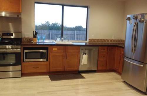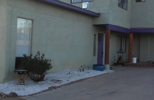 Unwind in the spacious living room with its comforting wood-burning stove, and stunning, wood-beam, vigas ceiling. Enjoy your favorite beverage and food at the table in the living room, in the comfortable kitchen, or at the patio table outside. This completely-remodeled house is free of carpet, stairs and steps, and offers wheelchair-accessible living spaces, master bedroom, and bath. A large utility room includes a washer and dryer. Delight in the pleasures that this central heated, air-conditioned sanctuary offers! Please Note: there is a 3-night minimum. Also, because we travel back and forth from Austin, TX, it's likely that we may be on site during your stay. While this space is attached above the house, it has a separate parking, entrance, HVAC system.