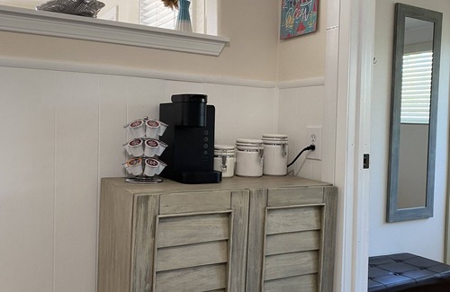 The kitchen includes a Keurig, microwave, stove, full-sized refrigerator, a traditional coffee maker, and basic cook/silverware. Limited spices and cooking oil is also provided.