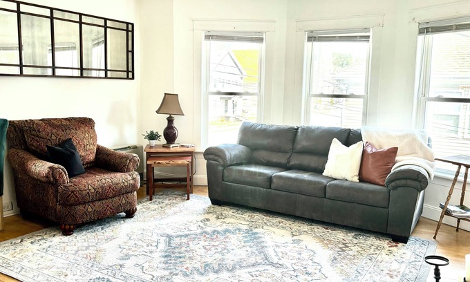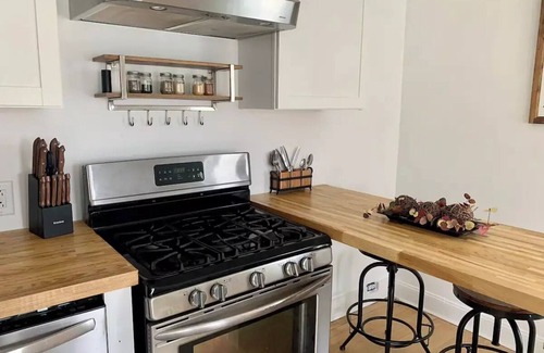 Centrally, located between Lake Placid & Plattsburgh, NY in the heart of Au Sable Forks on the main road to Wilmington (White Face), & Lake Placid. We’re directly on the East branch of the Au Sable River & walking distance to many things. Including, a shuttle to Lake Placid/Whiteface. Unit 3 is located on the second floor and has 2 large, beautifully decorated bedrooms with views of the AuSable River. Bedroom 1 has a queen bed & bedroom 2 has a full size bed with a twin trundle. The open concept kitchen-living room features stainless steel appliances, butcher block countertops with bar seating, a large pantry with complimentary coffee & tea, a microwave & toaster oven. As well as tons of storage for additional food. The living room area has a 60” smart TV for all your streaming Apps. Each unit has shared access to the yard, which faces the river and features outdoor seating and a fire pit. Firewood, will be provided for your convenience. From the yard you can take the short path down the bank to access the river. This building was originally constructed in the 1900’s & still has some of it’s original charm but has been recently updated.