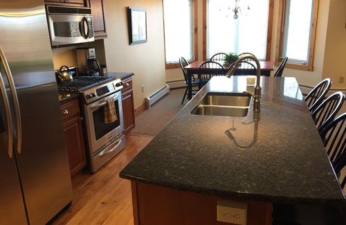 The fully equipped cook’s kitchen has cherry cabinets, granite countertops and new stainless appliances. Relax in the large living area by the cozy brick hearth gas fireplace after a day on the slopes, and enjoy the 49” flat screen HD TV with DirecTV, Roku, DVD player, family movie library, and board games. French doors look out over the woods and trails. The condo has been immaculately maintained and has been updated recently with new living room furniture.