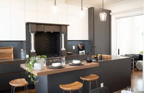 Gorgeous, spacious, light-filled 2-story brownstone home in Bed Stuy, Brooklyn, New York. First floor with a great living room area, half-bath, state of the art kitchen, and dining space for up to 6 guests. There is a master bedroom w/ king-size bed, full bath w/tub, and double sinks on the second floor. The second room, double function space office, w/ 2 single beds, n' an adjacent full bath n' laundry. Everything you need for a quiet, luxurious stay or remote work, short drive from Manhattan.