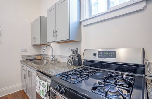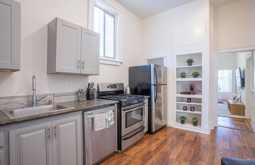 Situated on the top (2nd) floor, this 3-bedroom, 2-bathroom unit has a shared backyard space, storage room, in-unit washer/dryer, a modern kitchen with stone countertops and stainless steel appliances- perfect for a comfortable stay.