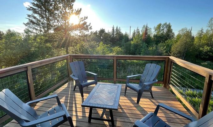 Welcome to a 3 bedroom, 2 bath, 1600 sq ft apartment in prime location within city limits. There are three large bedrooms with queen premium mattresses. You will love the wood ceilings, the fully equipped kitchen, the electric heating fireplace in the living room, the large mudroom/laundry, outdoor deck, fire pit, and more! Enjoy the woodsy feel and views from this 2nd story apartment, fully air conditioned for the warm summer months. Semer's Park on Shagawa Lake, with swimming and playground, is a short walk on walking trail. Walking, biking, ATV and snowmobile trails are right out your door with lots of room for your trailers in our drive-through off-street lot! Have a larger group? We also have a 2 bedroom, one bath unit on the ground floor. You can check it out at VRBO listing #2525682.