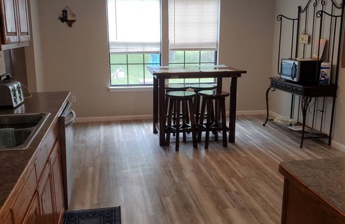 It is spacious! There is 3 bedrooms and 2 full bathrooms. One large master bathroom with a garden tub and shower. 2 tables. One in the kitchen and one in the dining room. PLenty of rooms. Minutes from St. Francisville. It is on Hwy 61. Note the dishwasher is broken and is not listed as an amenity. Also check out is 10 AM and is on the front of the website.