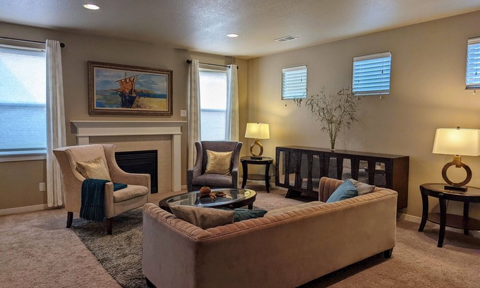 Spacious 3-bedroom with comfortable loft located in a quiet neighborhood with a large kitchen. Convenience located near Costco, the Oakway Center, Gateway Mall and within 10 minutes to Downtown Eugene and the U of O. The home has an outdoor space with sectional seating and propane fire pit with a patio heater for the evening. Three parking space are available with central air conditioning and heating.