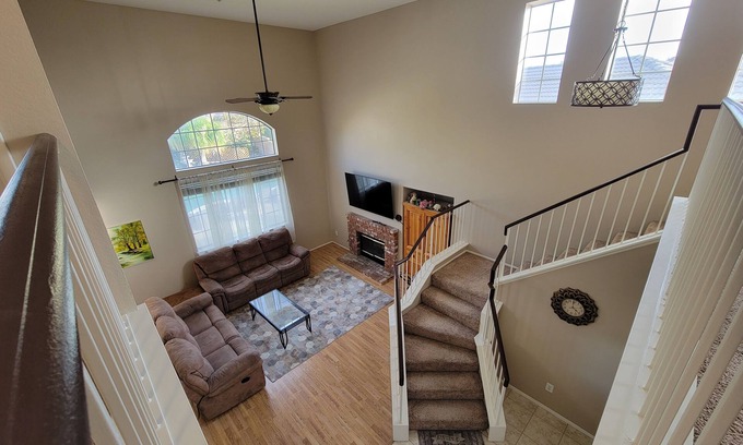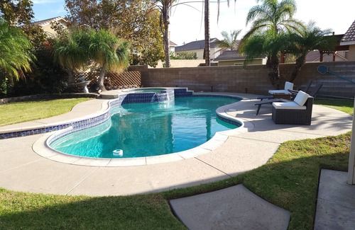 Our gorgeous 3 bed / 3 bath pool home is located in one of the most desirable neighborhoods in Fontana! Gorgeous 2 stories with modern touches. The home features one king bed, 2 queen beds and a futon in the master bedroom. The open floor plan is spacious enough to accommodate up to 12 guests.