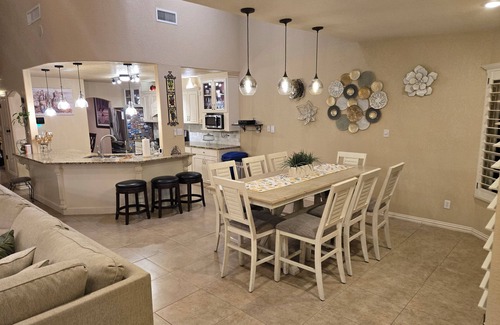 Escape to this Spectacular Home with Swimming Pool in picturesque El Paso. Minutes away from Mall, Restaurants, and Movie theaters. With 3 bedrooms including a king bed, futon, queen beds, and a bunk bed, this home offers a comfortable stay for up to 10 guests. Enjoy 3,5 bathrooms with amenities like a shower, jetted bathtub, and hair dryer. Relax in the cozy living spaces and take advantage of the Refrigerated Air, WiFi, and Washer & Dryer. We look forward to welcoming you to our place.