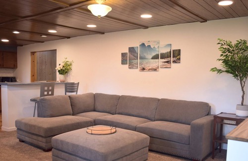 Entering the home, you will walk directly into the open concept living room and kitchen, with a dining room off of the kitchen. The kitchen is fully equipped with a stove, refrigerator, and microwave, Keurig (bring your own k-cups), as well as pots, pans, dishes, etc; however there is no dishwasher. The kitchen offers a bar height counter with seating for 4, plus an extendable dining room table which seats 8 people.