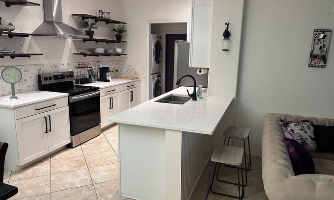 Inside, you’ll find a bright and inviting living space designed for both short visits and extended stays. The open floor plan connects a fully equipped kitchen with modern appliances to a cozy dining area and comfortable living room, perfect for family meals or relaxing evenings. Each bedroom is thoughtfully furnished with plush bedding and plenty of storage, ensuring a restful night’s sleep. The two bathrooms are updated and stocked with essentials for your stay.