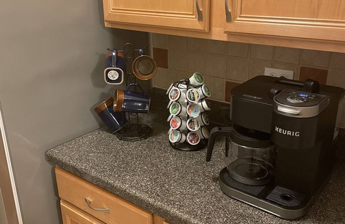 - Kitchen appliances including a microwave, waffle maker, coffee pot, tea kettle, and toaster.