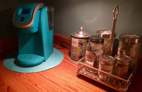 Terra-cotta tile extends into the kitchen. Its large galley design includes tons of prep space on butcher block counters and a double stainless sink. Everything you need is here: an electric range, side-by-side refrigerator/freezer w/ water and ice, a microwave, toaster and a Keurig coffeemaker. The kitchen door makes it easy to take dinner out to the patio.