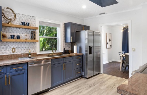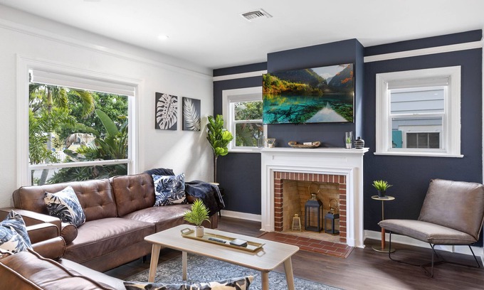 Tropical views and Florida vibes. Located just off the intracoastal waterway golf course, we cannot wait to welcome you into one of Florida's most beautiful historic districts. As you step into our fully renovated 1930's home, you will be immediately greeted with every modern luxury imaginable. Fully Fenced yard and deck, 4k tvs, Granite countertops, vintage soak tub, and so much more! We cannot wait to host your escape away in our spacious home.