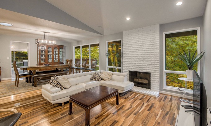 Welcome to our recently (November 2023) remodeled 6 bedroom/3.5 bathrooms house with a lot of space to play and relax in the house or at the backyard next to the creek. We have the fully equipped kitchen, the grill and the big dining table which can accommodate at least 14 people. There are three bedrooms on the main floor, easy to access, and other three bedrooms and the playing area are downstairs. The living area is next to the dining where we have TV and sofa bed. There are two decks, one accessible from the kitchen, another from master bedroom. The loft with TV and extra sofa-bed is above the kitchen. Please find the pictures which include the detailed floorplan and some furniture description.