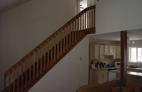 The main level is air-conditioned and features a living room with vaulted ceiling and a brick wood-burning fireplace. The dining area leads to a screened porch. We offer a full well-equipped kitchen with a breakfast island and all cooking utensils. On the main level you will also find a master bedroom with a queen-size bed, walk-in closet and a full bathroom.