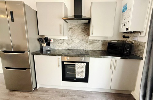 Well‑equipped modern kitchen: basic utensils, fridge/freezer, oven, microwave.