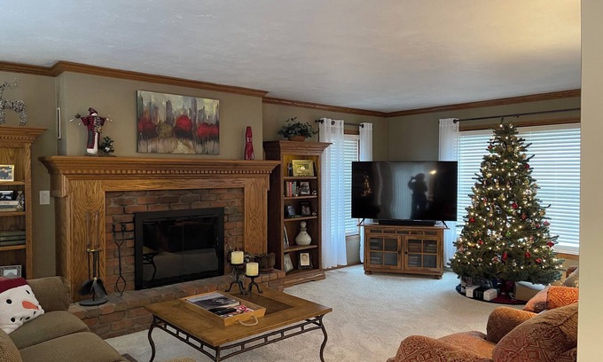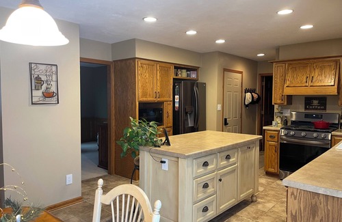 This 4-bedroom house in De Pere is perfect for your escape. With 2 full beds and 2 queen beds, it's an excellent choice for families or groups. Enjoy the convenience of amenities like a hair dryer, washing machine, AC, iron, and WiFi. The 4 bathrooms with showers and hair dryers make getting ready a breeze. We'll be available to answer any questions while you stay at our place. Large living room, den, large kitchen and deck outside kitchen. TV room, Bar area and 1 bedroom and full bath in finished basement.