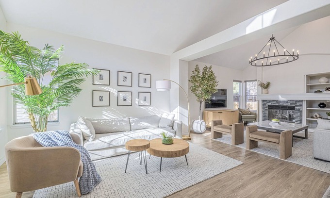 This home features vaulted ceilings and large windows that flood the space with natural light, enhancing the modern decor and neutral tones. Relax in the airy living room or unwind in the serene sunroom—ideal for morning coffee or a peaceful read.