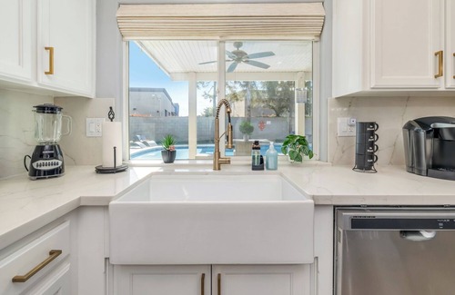 We are pleased to offer a fully stocked kitchen for your convenience. The kitchen is equipped with stainless steel appliances, quartz countertops, and a beautiful island. You will find everything you need to prepare your meals. We provide complimentary coffee, creamer, and a selection of cooking pans so you can craft your meals.