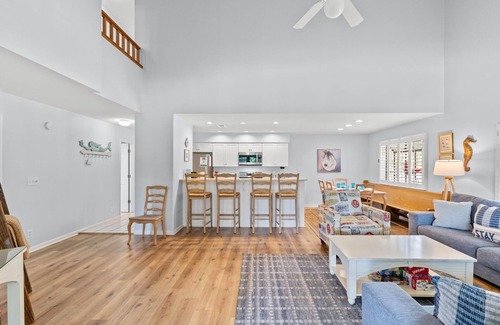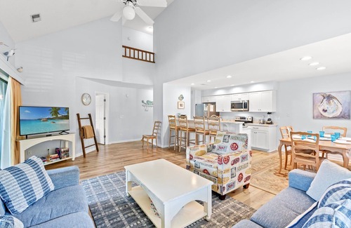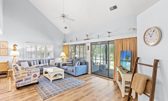 The villa features a well-appointed open floor plan that includes a full kitchen, dining area, and inviting living space that flows into a massive screened-in porch. Each of the four bedrooms offers either two queens or two doubles, ensuring ample sleeping arrangements for your wedding party or guests. Take advantage of the amenities, including in-unit laundry, streaming TV, and complimentary Wi-Fi, to enhance your stay. Additionally, the property boasts direct access to championship golf courses and various recreational activities, making it easy to plan a memorable wedding experience.
