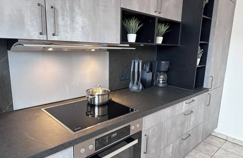 The well-equipped kitchen is designed for your convenience. It is a closed-off kitchen that includes an electric stove with four cooking plates, an oven, a microwave, and a dishwasher, as well as essential cookware, utensils, and a coffee machine. You will find everything you need to prepare delightful meals during your stay. The kitchen is complemented by a snug breakfast nook, ensuring that you start your day off right.