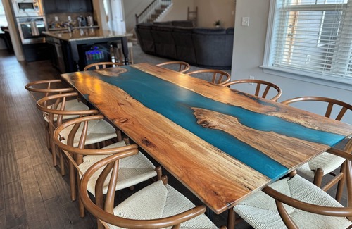 The dining area seats 10 at our river table and 4 at the island. Our beverage fridge comes stocked with bottled water and sodas as well as snack baskets and coffee bar for guests.