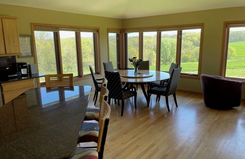Rural Verona is waiting for you at this superb 5-bedroom fully equipped country home surrounded by verdant hills, trees, alfalfa fields and majestic vistas in all directions. Adjacent to the 800 acres of the Sugar River Wildlife Area and the 300 acres of the Madison School Forest the wildlife is abundant with regular viewing of deer, turkey, geese, cranes and songbirds. Hiking, biking, canoeing nearby. Epic and downtown Verona 5 minutes away and Madison just 15 minutes, Dane County airport 30 minutes. Sleeps up to 8 with 1 king bed, 4 queen beds, 1 twin bed, and a futon this marvelous property offers plenty of space for guests. The 3 bathrooms, each with bathtub and shower, ensure everyone stays comfortable. The modern kitchen with maple cabinets and granite counter tops is fully equipped, dining room has a round table seating 8 and living room plus outdoor deck provides the perfect gathering space for family or friend gatherings. A great place to call home base while you're away. We hope you enjoy your stay. Two night minimum and discounts for week and longer. Family friendly. Please no pets, no smoking. Property owned and managed by retired University of Wisconsin College of Agriculture and Life Sciences professor.