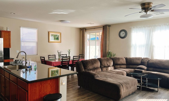 Enjoy a peaceful stay at this 5-bedroom house in Las Vegas. The bedrooms feature a king bed, 3 queen beds, 1 full bed, and 1 twin bed, ensuring a comfortable night's sleep for all guests. With AC and heating, you'll stay cozy no matter the season. Three bathrooms are available for your convenience. Enjoy all that Las Vegas has to offer when you stay at our place.