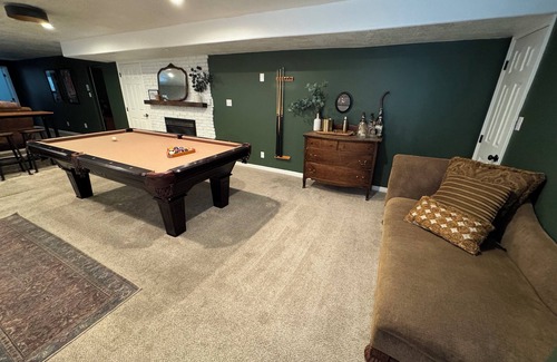 The space includes a theater room, along with a billiards table, ping pong, and arcades. The kitchen is equipped with all basic appliances and essentials. It has a dishwasher, blender, microwave, toaster, crockpot, stove, and oven and a bar table w/ 3 stools.