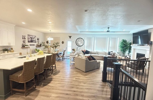 Escape to this superb picturesque house in the country. With 5 bedrooms including 2 king beds and 3 queen beds, an office space with a queen Murphy bed this home offers plenty of space for guests to relax. Enjoy the 3 bathrooms, all with shower/bathtubs, and additional spaces like a fitness room and comfy couches with a queen pull out. Whether you're unwinding in the living room or exploring the area, this fantastic property is the perfect retreat for your getaway. Located right in the Mecca of all the beautiful major Utah attractions, including mountains, lakes, rivers, ski resorts perfect for hunting, fishing, boating, paddle boarding and hiking! You will have a breath taking mountain view out on the deck. The house is set up for any type of entertainment you could ask for all under one roof. Pool table, theater room, indoor basketball game, golf simulator room, complete gym with Soul cycle, full casino setup, darts, and last but not least card and board games of all sorts. Outside on our fully turfed yard you can enjoy, the hottub, fire pit, outdoor seating and lounge area, while playing golf, cornhole, and other fun games. A blackstone, and barbecue grill with a fully stocked kitchen, for all your culinary needs. We have built a place hoping for it to be the one stop shop, once you're there for the night you won't have a reason to leave to have fun! We love our space created for family, friends and good times. Hoping you make great memories that will last a lifetime. We'll be available to answer any questions while you stay at our place.