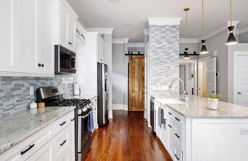 Each bedroom is very spacious, and the two large full bathrooms for the 4 bedrooms upstairs make it a great spot for large groups. You'll have extra blankets and pillows to make sure you're comfortable during your stay. The primary bedroom is on the first floor with a private bathroom with a huge shower and spacious closet. There are two rooms with queen beds and one room with a twin on the second floor, and a room with a double bed on the third floor. There's plenty of space between the rooms to give you some privacy.