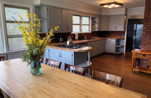 A bright and inviting retreat surrounded by nature! This spacious home offers large open areas both indoors and out, making it the ideal spot for family and friends to relax and enjoy quality time together. Perched atop a hill, the house boasts a private patio complete with a fire pit and grill, with serene views of our charming kitchen garden and the woods.