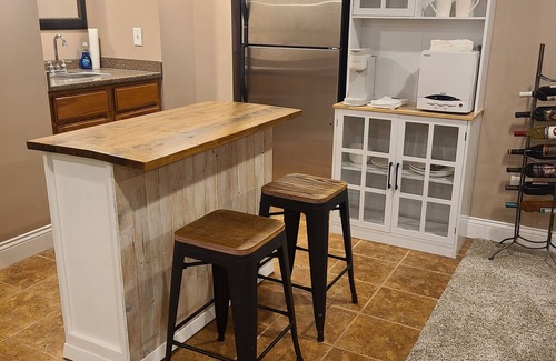 5 Bedrooms: Three upstairs, plus a basement suite with kitchenette.