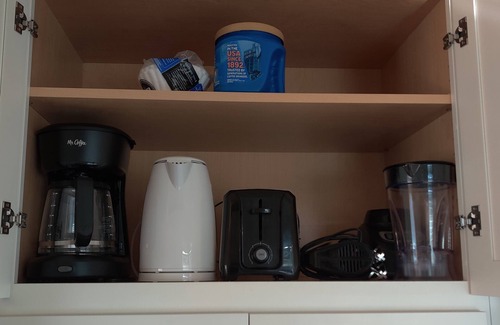 There is kitchen upstairs & one downstairs. They are well-stocked with the necessities (dinnerware, silverware, cups, pots & pans, a blender, etc).
