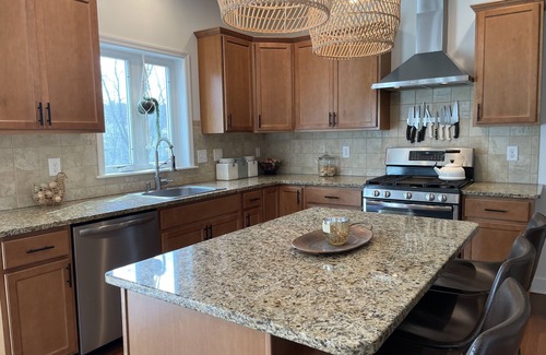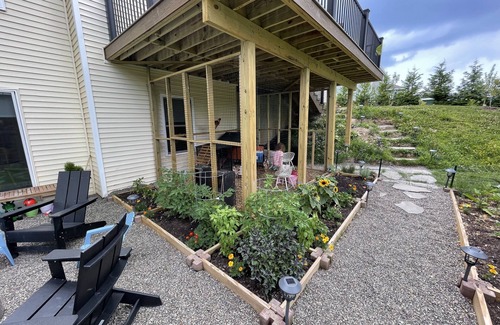 Venture outside and discover your own private oasis, complete with a vegetable garden where you can harvest fresh produce, and friendly chickens providing farm-fresh eggs for your morning breakfast. Admire the beautifully landscaped grounds as you unwind by the fire pit, surrounded by comfortable Adirondack chairs, perfect for sharing stories and making memories under the stars.