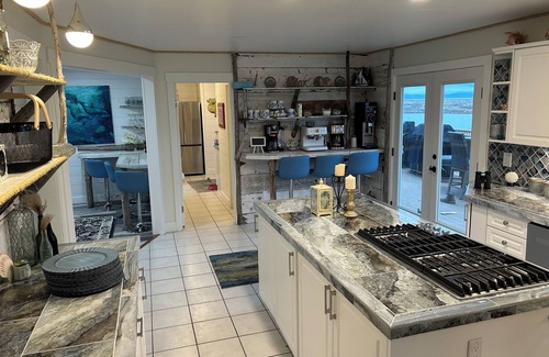 The layout of this home: The main floor - You enter front door into the grand entry with a spiral staircase. There is a living room area with a flatscreen TV and recliners for those who want extra comfort, a large dining room with seating for approx. 14 people plus a small bar area, kitchen area with a wall that is set up for a coffee/hot cocoa bar - center prep area with propane burners -electric oven with electric burners; you choose how you want to prepare your feast. There is a billiard room off the dining room - complete with billiard table and a flatscreen TV as well as a smaller size bedroom off the billiard area with a queen bed for those who prefer less stairs. There are French doors from the billiard room, kitchen and living room/breakfast table room to the expansive deck!!