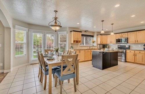 "Find your serene Utah getaway at our spacious, well-appointed 6-BR home in Clearfield, comfortably sleeping 12. Shadowed by lush parks, near top attractions like Hill Air Force Base and Fox Hollow Park, our picturesque retreat is the perfect mix of comfort and entertainment. With summer around the corner, our park-access backyard is an unbeatable feature for family fun or serene solitude."