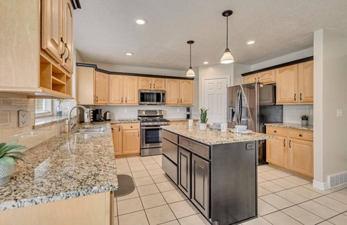 2) Entertainment: Revamp family time with our fully-stocked game basement, featuring a game table, air hockey/ping-pong table, and a lounge area complete with plush seating and a TV. When the day gives way to night, unwind in our vibrant a fully-equipped kitchen ready to assist you with memorable meal preparations.