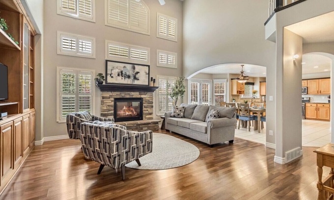 1) Space: Boasting six beautifully designed bedrooms and 3.5 modern bathrooms, our home comfortably sleeps 12 guests. The heart of the house - an imposing, two-story living room - is an oasis of tranquility where natural light cascades in through grand windows, complemented by a cozy fireplace. The main-floor master suite, with its en-suite bathroom and walk-in closet, offers a private sanctuary for couples. The additional bedrooms cater to the many, with flexible sleeping layouts and thoughtful amenities.