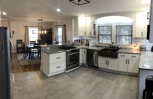 The amenities at Derby House are designed to cater to your every need during your stay. You will find four beautifully appointed bedrooms, including a luxurious king room and spacious bunk options suitable for all ages. The main floor features a versatile office space that can easily convert into a cozy bedroom, while the basement adds extra sleeping quarters with another king and queen bed. Enjoy stocked bathrooms, a well-equipped kitchen with available condiments and spices, and a welcoming backyard complete with a large deck and grill, perfect for post-wedding gatherings or relaxing evenings under the stars.