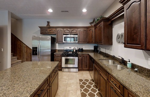 Your comfort is prioritized here, featuring six beautifully appointed bedrooms, four and a half bathrooms, stainless steel appliances, and elegant granite countertops. Gather with your wedding party in the open layout that fosters togetherness, or unwind in the private hot tub while taking in the breathtaking views. Modern conveniences like flat-screen TVs and a well-equipped kitchen ensure that your stay is not only relaxing but also memorable as you prepare for your wedding festivities.