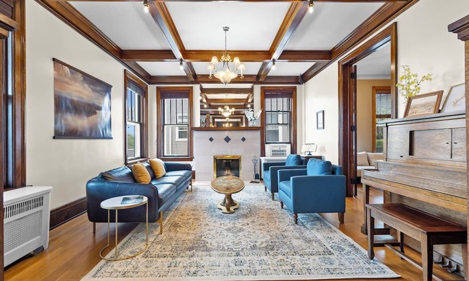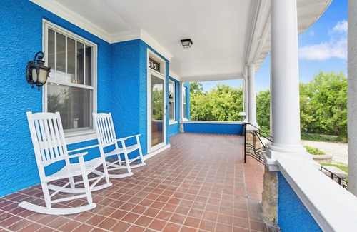 Experience Dubuque history in this charming 7-bedroom house. With 3 king beds, 2 bunk beds, and 2 queen beds, there's plenty of space for all guests. Enjoy the many living spaces for relaxing, watching TV or playing games with friends. The home also offers en suite bathrooms and a fully stocked kitchen. Whether you're relaxing on the portico with a view of the city or out exploring, this house is the perfect home base for your getaway. We look forward to welcoming you to our place.