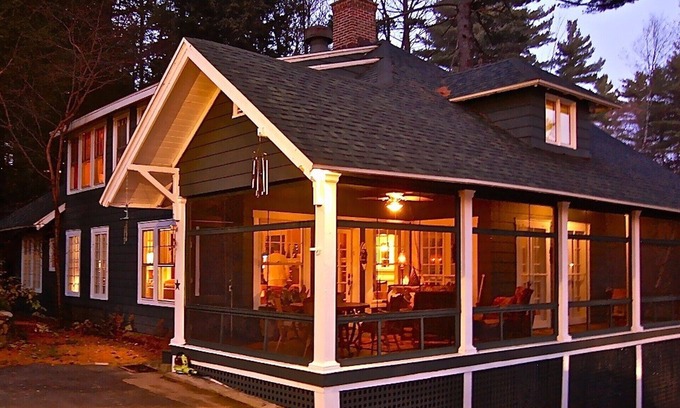 An L-shaped wrap-around screened-in porch spans the front and side of the house, with spectacular views of the lake. The porch has comfortable lounging porch furniture as well as a dining table/chairs for outdoor dining, taking in the fresh lake air, and enjoying the calls of the loons.